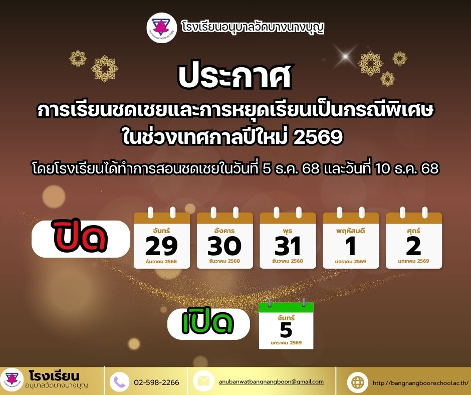 ประกาศโรงเรียนอนุบาลวัดบางนางบุญ เรื่อง การเรียนชดเชยและการหยุดเรียนเป็นกรณีพิเศษในช่วงเทศกาลปีใหม่ 2569