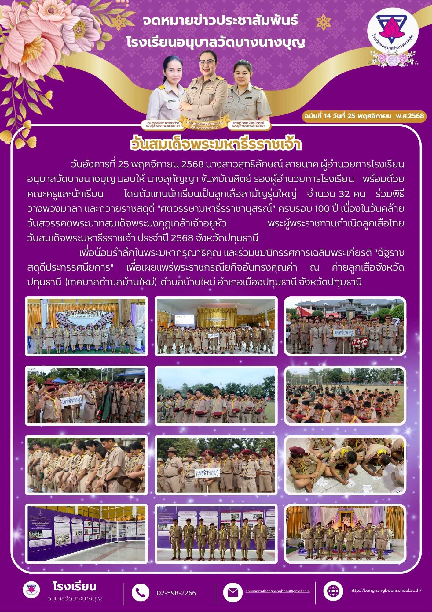 วันอังคารที่ 25 พฤศจิกายน 2568 นางสาวสุทธิลักษณ์ สายนาค ผู้อำนวยการโรงเรียนอนุบาลวัดบางนางบุญ มอบให้ นางสุกัญญา ขันฑบัณฑิตย์ รองผู้อำนวยการโรงเรียน พร้อมด้วยคณะครูและนักเรียน โดยตัวแทนนักเรียนเป็นลูกเสือสามัญรุ่นใหญ่ จำนวน 32 คน ร่วมพิธีวางพวงมาลา และถวายราชสดุดี “ศตวรรษามหาธีรราชานุสรณ์” ครบรอบ 100 ปี เนื่องในวันคล้าย วันสวรรคตพระบาทสมเด็จพระมงกุฎเกล้าเจ้าอยู่หัว พระผู้พระราชทานกำเนิดลูกเสือไทย ประจำปี 2568 จังหวัดปทุมธานี