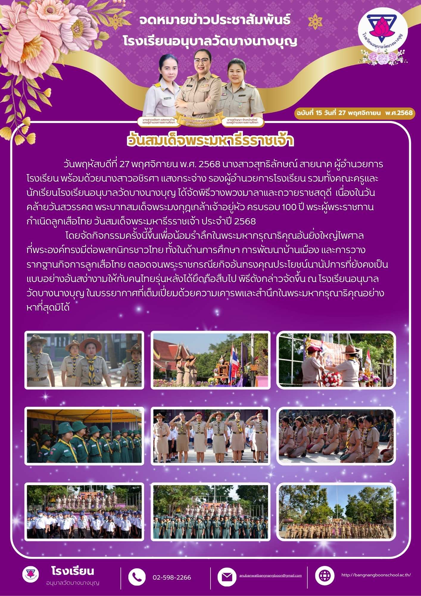 วันพฤหัสบดีที่ 27 พฤศจิกายน พ.ศ. 2568 นางสาวสุทธิลักษณ์ สายนาค ผู้อำนวยการโรงเรียน พร้อมด้วยนางสาวอชิรศา แสงกระจ่าง รองผู้อำนวยการโรงเรียน รวมทั้งคณะครูและนักเรียนโรงเรียนอนุบาลวัดบางนางบุญ ได้จัดพิธีวางพวงมาลาและถวายราชสดุดี เนื่องในวันคล้ายวันสวรรคต พระบาทสมเด็จพระมงกุฎเกล้าเจ้าอยู่หัว ครบรอบ 100 ปี พระผู้พระราชทานกำเนิดลูกเสือไทย วันสมเด็จพระมหาธีรราชเจ้า ประจำปี 2568