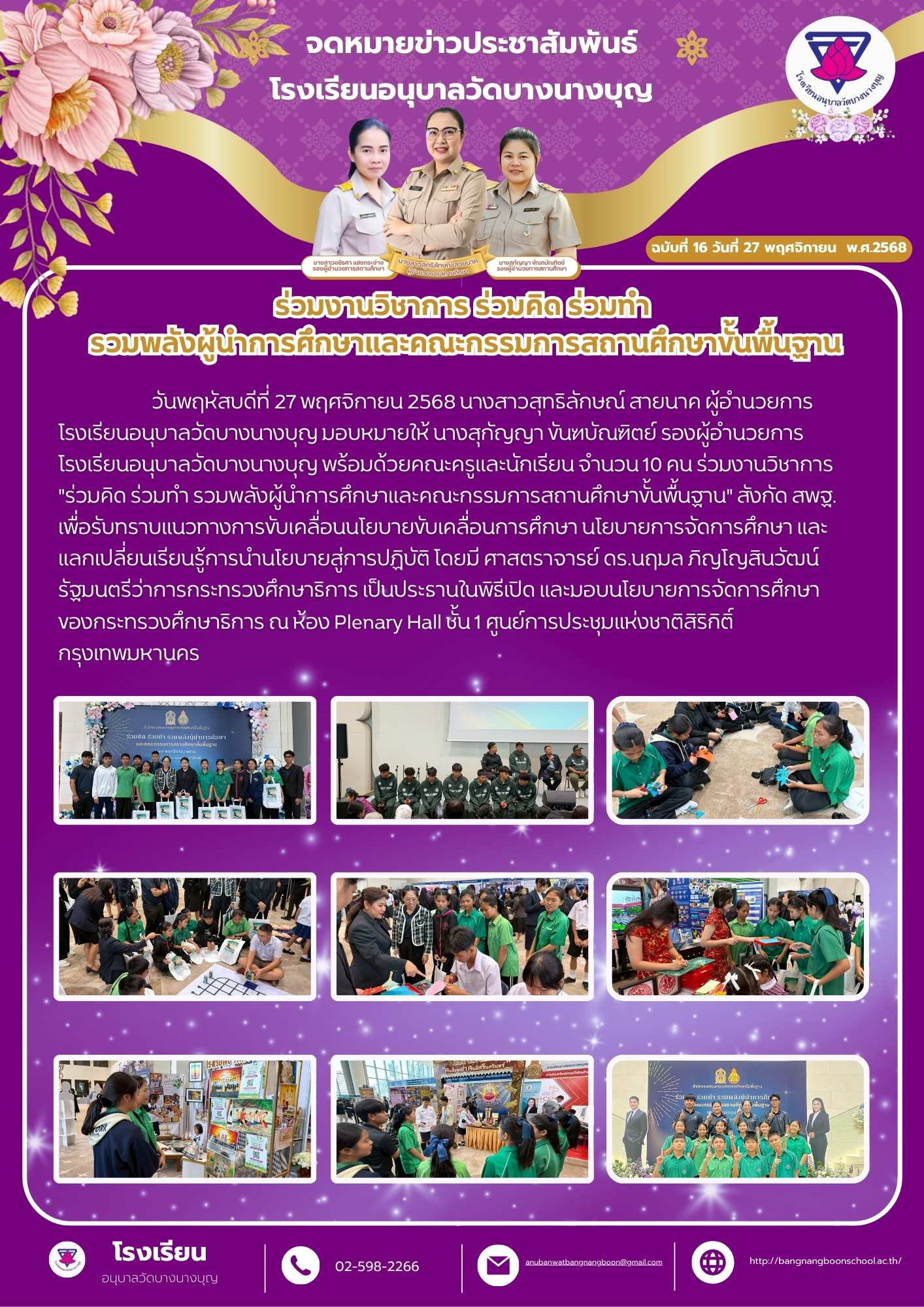 วันพฤหัสบดีที่ 27 พฤศจิกายน 2568 นางสาวสุทธิลักษณ์ สายนาค ผู้อำนวยการโรงเรียนอนุบาลวัดบางนางบุญ มอบหมายให้ นางสุกัญญา ขันฑบัณฑิตย์ รองผู้อำนวยการโรงเรียนอนุบาลวัดบางนางบุญ พร้อมด้วยคณะครูและนักเรียน จำนวน 10 คน ร่วมงานวิชาการ "ร่วมคิด ร่วมทำ รวมพลังผู้นำการศึกษาและคณะกรรมการสถานศึกษาขั้นพื้นฐาน" สังกัด สพฐ. เพื่อรับทราบแนวทางการขับเคลื่อนนโยบายขับเคลื่อนการศึกษา นโยบายการจัดการศึกษา และแลกเปลี่ยนเรียนรู้การนำนโยบายสู่การปฏิบัติ โดยมี ศาสตราจารย์ ดร.นฤมล ภิญโญสินวัฒน์ รัฐมนตรีว่าการกระทรวงศึกษาธิการ เป็นประธานในพิธีเปิด และมอบนโยบายการจัดการศึกษา