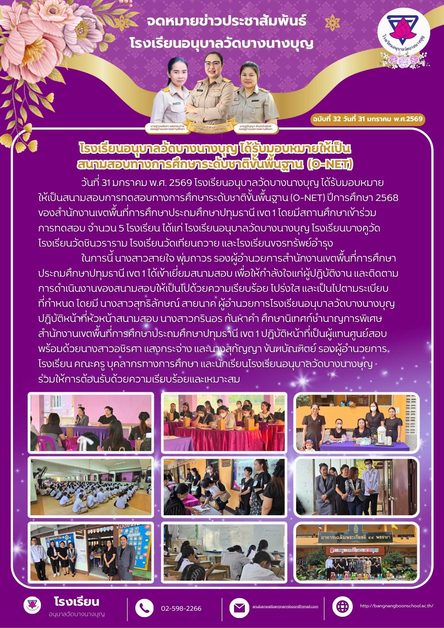 โรงเรียนอนุบาลวัดบางนางบุญ ได้รับมอบหมายให้เป็น สนามสอบทางการศึกษาระดับชาติขั้นพื้นฐาน (O-NET)