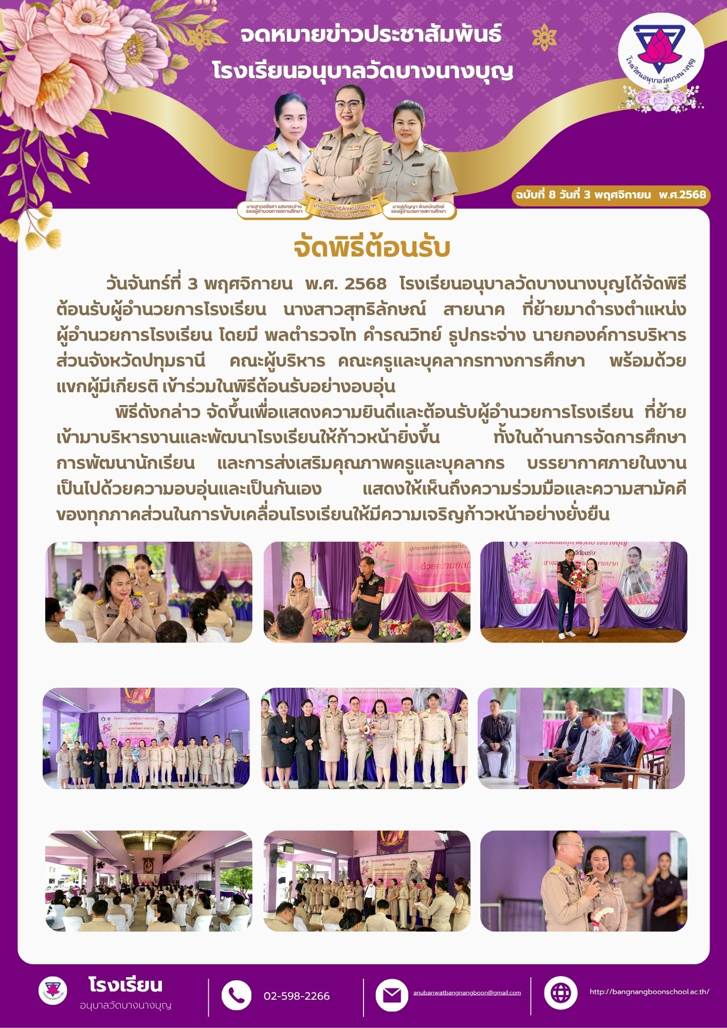 วันจันทร์ที่ 3 พฤศจิกายน พ.ศ. 2568 โรงเรียนอนุบาลวัดบางนางบุญได้จัดพิธีต้อนรับผู้อำนวยการโรงเรียน