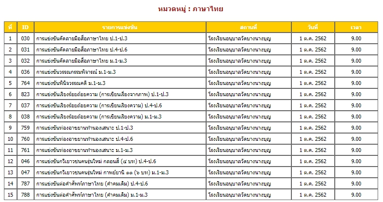 การแข่งขันศิลปหัตถกรรมนักเรียน ครั้งที่ 69 (ภาษาไทย) งานมหกรรมความสามารถทางศิลปหัตถกรรม วิชาการและเทคโนโลยีของนักเรียน ระดับชาติ ปีการศึกษา 2562 สำนักงานเขตพื้นที่การศึกษาประถมศึกษาปทุมธานี เขต 1 ในวันอังคารที่ 2 ตุลาคม 2562 โรงเรียนอนุบาลวัดบางนางบุญ เป็นสนามแข่งขันหมวดหมู่ "ภาษาไทย" เริ่มแข่งขันทุกรายการตั้งแต่เวลา 09.00 น. เป็นต้นไป