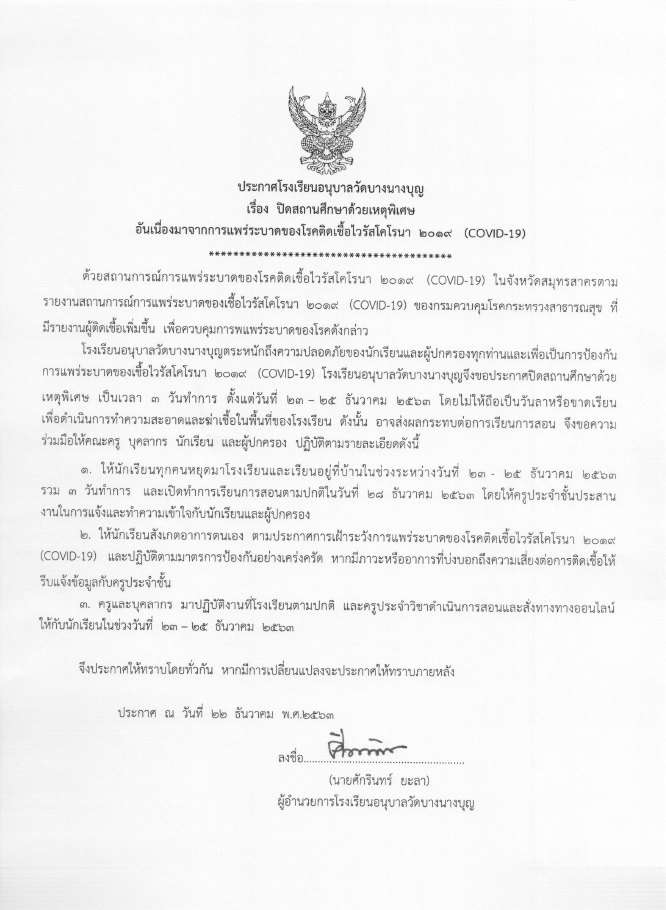 ประกาศปิดสถานศึกษาด้วยเหตุพิเศษการเฝ้าระวังการแพร่ระบาดของเชื้อไวรัสโคโรนา 2019